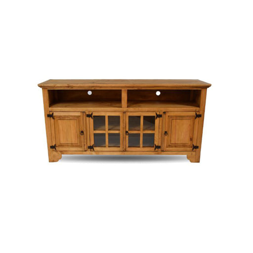 Handcrafted solid rustic pine TV stand with uniquely designed hand forged iron hardware. Storage cabinets provide space for your media needs. This ...