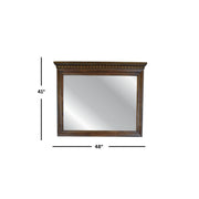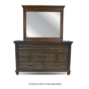 The frame is a masterclass in traditional craftsmanship. It features the same deep smoky walnut finish found across the collection, providing a moody and sophisticated backdrop for the glass. The top edge is accented with classic dental molding, while the inner frame is finished with precision-cut beveled edges, echoing the refined details of the McCoy King Storage Bed.