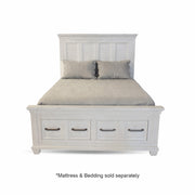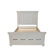 The hand-applied antique white finish is intentionally distressed, adding a layer of rustic warmth that prevents the large king-sized frame from feeling overwhelming. To maximize your room's efficiency, the footboard features two integrated, oversized storage drawers. These are perfect for stowing away seasonal bedding, extra pillows, or bulky linens, keeping them tucked out of sight but within easy reach. Finished with bold black metal hardware on the storage fronts and supported by sturdy square feet, the McCoy King Storage Bed is a durable, sophisticated retreat that keeps your sanctuary feeling airy, organized, and inviting.