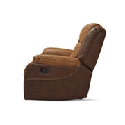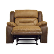 Elevate your personal relaxation space with the Bonanza Recliner, a piece that perfectly balances rugged charm with refined comfort. This chair is upholstered in a high-performance, breathable faux leather that offers the weathered look of real hide with superior durability. The visual appeal is defined by its contrasting two-tone finish, utilizing deep cocoa brown on the exterior arms and base to frame the warm, tobacco-hued seating area.