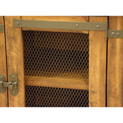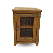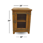 Elevate your home decor with the Chesterfield Chairside Table, a masterful blend of farmhouse warmth and industrial edge. This compact side table is constructed from durable wood with a multi-step distressed finish that highlights the natural grain and character. The standout feature is the single cabinet door, which boasts a metal wire-mesh insert and authentic sliding latch hardware, allowing you to peek at your stored items while keeping them organized.