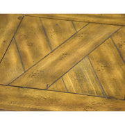 The top surface features a beautiful herringbone-patterned inlay, providing a sophisticated touch to the rugged design. Whether placed next to a leather recliner or used as a rustic nightstand, this piece provides both functional storage and a striking focal point for your interior design.