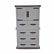 The Antique White Mansion Chest is a celebration of classic craftsmanship and country charm. Designed to provide maximum organizational capacity, its tall and robust silhouette houses multiple spacious drawers to accommodate everything from bulky linens to everyday wardrobe essentials. The chest is defined by its heavily distressed white finish, which artfully reveals glimpses of the wood beneath for a genuine vintage feel. Detailed carved accents along the frame and elegant antique-style hardware further enhance its heirloom quality.