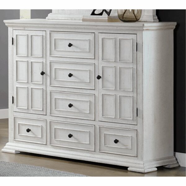 The image shows the Heather Rustic White Dresser and Mirror. The dresser is a rustic, farmhouse-style piece made of wood with a distressed white finish that gives it a vintage, weathered appearance. It has a rectangular shape with a thick, molded top and a sturdy, decorative base featuring carved feet. The front design includes 6 drawers with a two round black knobs and 2 cabinets. The drawers and cabinet doors are framed with beveled molding that adds depth and character to the piece. Subtle distressing along the edges highlights the craftsmanship, creating a charming and timeless look suitable for a cozy or traditional bedroom setting.
