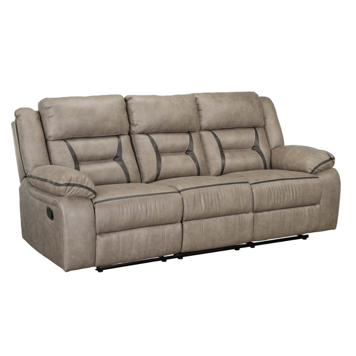 The Acropolis Taupe Livingroom group features plush, generously cushioned seating upholstered in a soft taupe fabric that creates a warm, neutral foundation for the space. The set includes a reclining sofa, loveseat, and chair, each designed with supportive pillow-top arms, segmented back cushions, and smooth reclining mechanisms for everyday comfort. Subtle stitching details and gently contoured silhouettes give the group a clean, contemporary look without feeling overly modern. Paired with dark wood accent tables and a light patterned rug, the collection offers a balanced blend of coziness, functionality, and understated style ideal for a relaxed living area.