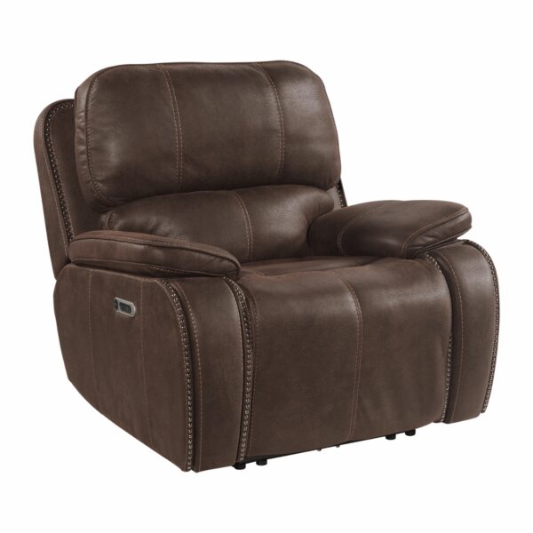 The Atlantis Power Motion Recliner with Power Headrest in Heritage Coffee offers the ultimate in comfort and style. Upholstered in rich, durable faux leather, it features plush cushioning with detailed contrast stitching for a sophisticated look. The recliner’s power controls allow effortless adjustment of both the footrest and headrest, providing personalized relaxation. Nailhead trim accents along the arms add a classic touch, while the deep coffee color enhances its warm, inviting appeal.