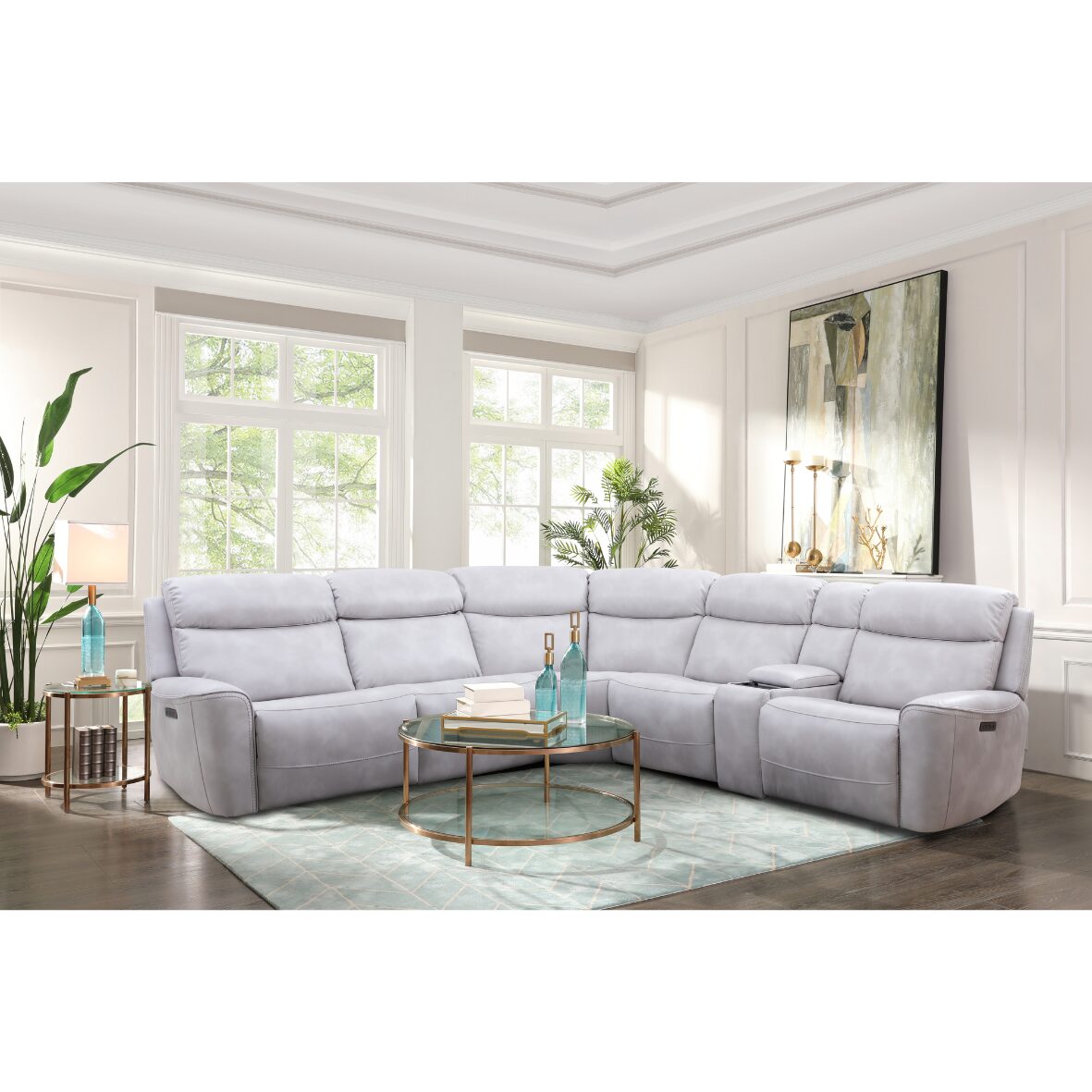 The Bolero Fog 6 Pc Sectional features a spacious, modern silhouette upholstered in a soft fog-gray fabric that brightens the room while offering plush, supportive cushioning throughout. Its dual power reclining seats with extended footrests provide customized comfort, allowing you to relax at the touch of a button. Thoughtfully integrated conveniences include a wireless charging pad, a hidden drop-down tray for drinks or devices, and discreet built-in lighting that adds a refined, ambient glow. Designed for both style and function, this sectional creates a luxurious, lounge-worthy centerpiece for contemporary living spaces.