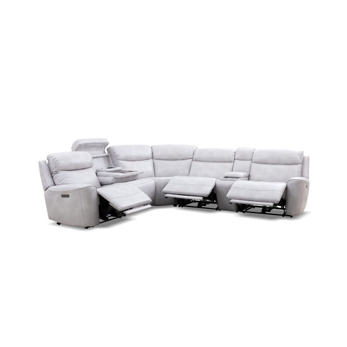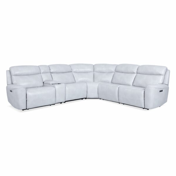 The Codigo Six-Piece Dual Power Reclining Sectional is a spacious and stylish seating option designed for comfort and functionality. It features dual power reclining seats, allowing users to independently adjust the footrests and headrests for customized relaxation. The sectional is upholstered in leather with plush cushioning and contrast stitching, giving it a sleek, modern look. It also includes a chaise lounge, multiple seating sections, and built-in armrests for added convenience. Perfect for large living spaces, this sectional provides ample room for lounging, entertaining, or movie nights.