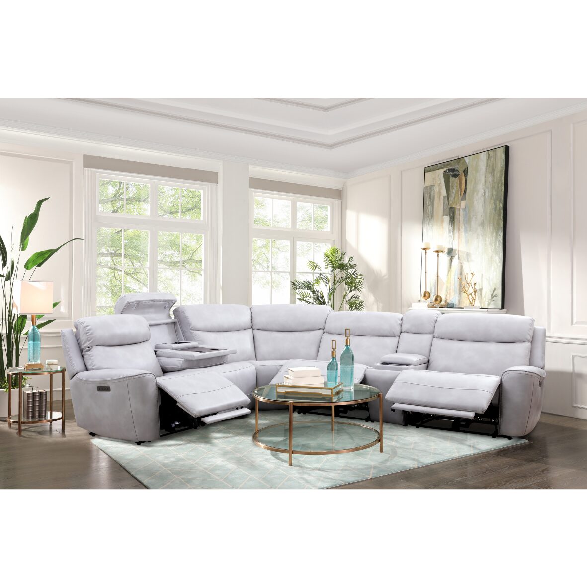Introducing the Avery Leather Sectional Triple Power Recline Zero Gravity Sofa with Wireless Charger and Extended Foot Rest. This elegant L-shaped sectional features smooth, light gray leather upholstery with vertical channel stitching that adds a modern and sophisticated touch. Each seat offers triple power functionality—allowing independent adjustment of the headrest, lumbar support, and footrest—plus a zero-gravity recline for superior ergonomic comfort. Built-in cup holders and a wireless charging pad enhance convenience, while the extended footrests ensure full-leg support. Its sleek design and luxurious features make it a perfect centerpiece for a contemporary living room.