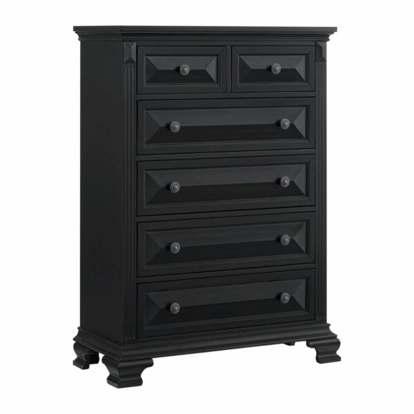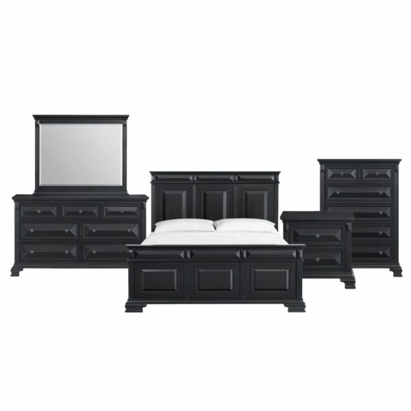 The Bridgestone Black Bedroom Group features a bold, traditional design with richly paneled fronts and deep black finishes that create a striking, upscale presence. The set includes a stately bed frame with raised panel detailing on both the headboard and footboard, giving it a timeless, architectural look. Coordinating pieces—dresser with mirror, chest, and nightstand—echo the same carved accents, beveled edges, and substantial moldings for a cohesive, elegant aesthetic. Each storage piece is equipped with spacious drawers and classic round knobs, blending functionality with refined craftsmanship. Overall, the collection brings a dramatic yet sophisticated feel to any bedroom.