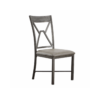 Mixed media and geometric designs combine in a soft gray palette for the Alamo Dining Collection. The Alamo Dining Chairs feature a grey metal finish with black hand brush accents with padded grey vinyl seat and a wooden cap rail with a unique geometric metal back design. X stretchers not only add a design element but strength and stability to the chairs as well. Also available is the matching Alamo dining table purchase separately.