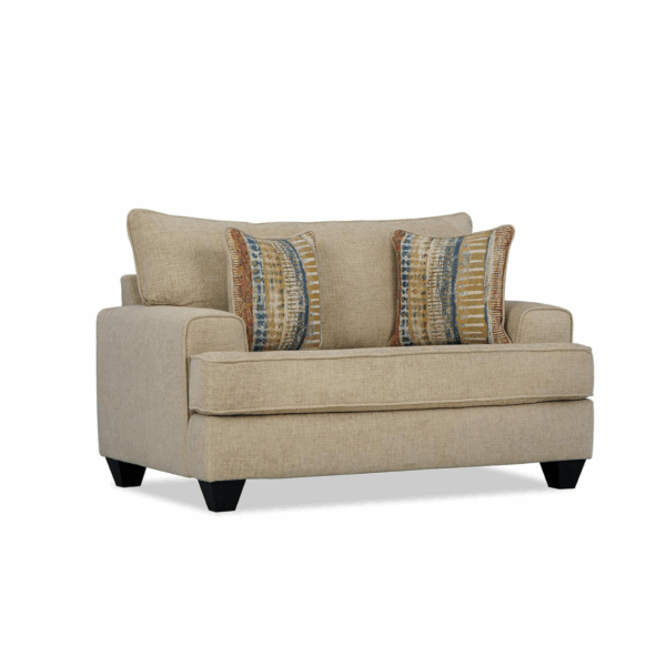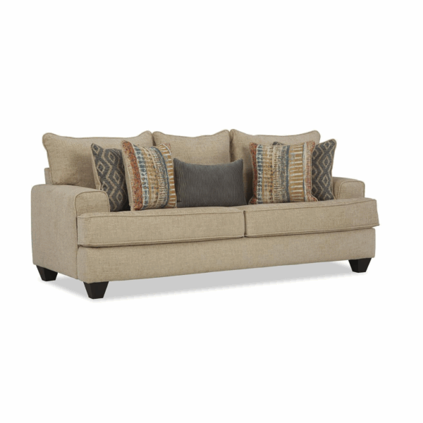Introducing the Becker Oatmeal/Driftwood Group, a classic and inviting piece with a timeless design. Upholstered in a soft, textured oatmeal-colored fabric, it features plush seat and back cushions that offer both comfort and support. The furniture’s gently rolled arms and block-style wooden legs add a traditional touch that complements a wide range of décor styles. Included with the sofa are four accent pillows—two in a cozy neutral weave and two in a plaid pattern—that enhance its warm, homey aesthetic. Perfect for a family living room or casual sitting area, the Becker Oatmeal Sofa combines style, comfort, and durability.
