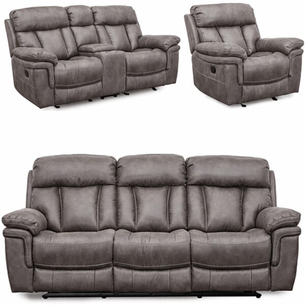 Introducing the Cowboy Slate Living Room Group. This is a plush set upholstered in a smooth, slate-gray fabric that resembles distressed leather. The features: generously padded headrests, lumbar cushions, and pillow-top armrests for superior comfort. Its contemporary design is accentuated by detailed stitching and contoured seat backs that provide ergonomic support. Built for relaxation and durability, this set combines modern style with everyday functionality, perfect for a cozy living space.