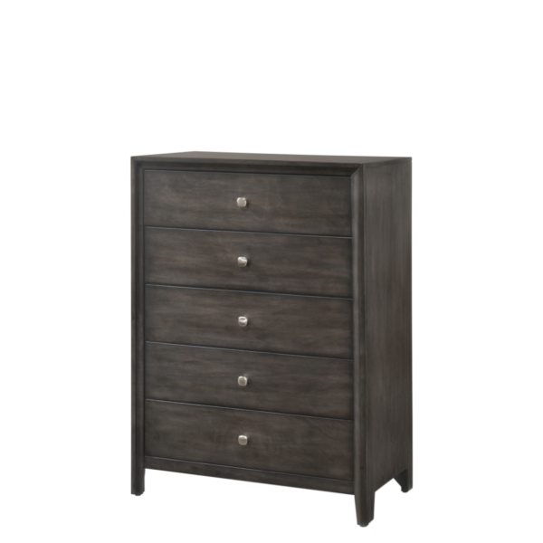 The Grant Bedroom Group combines sleek sophistication with contemporary comfort. This elegant set includes a modern bed with a curved headboard, a nightstand, chest, and dresser with mirror, all featuring clean lines and a chic dark wood finish. Each piece offers ample storage with spacious drawers and sleek hardware. The durable construction and smooth finish add a touch of elegance to your room, while the large mirror enhances light and space. Perfect for updating your master suite or creating a stylish guest room, the Grant Bedroom Group blends luxury with modern design, transforming your bedroom into a sophisticated retreat.