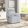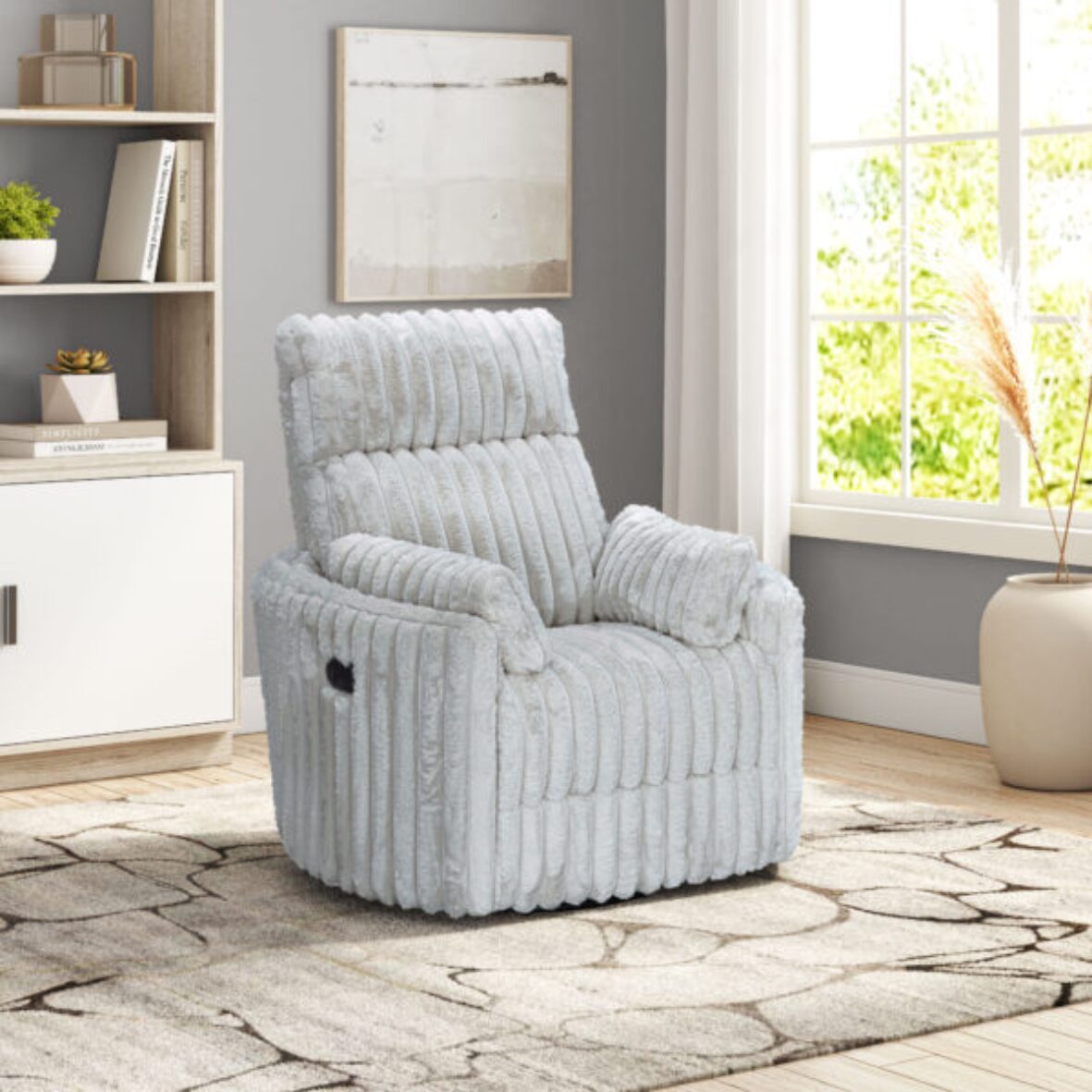 Relax in ultimate comfort with Gunmetal Swivel Glider. Upholstered in soft, plush fabric, this recliner features a stylish ribbed design in a soothing silver hue. Perfect for any living room or reading nook, it offers exceptional support and a smooth reclining mechanism. This recliner is the ideal addition to your home for cozy, relaxed seating