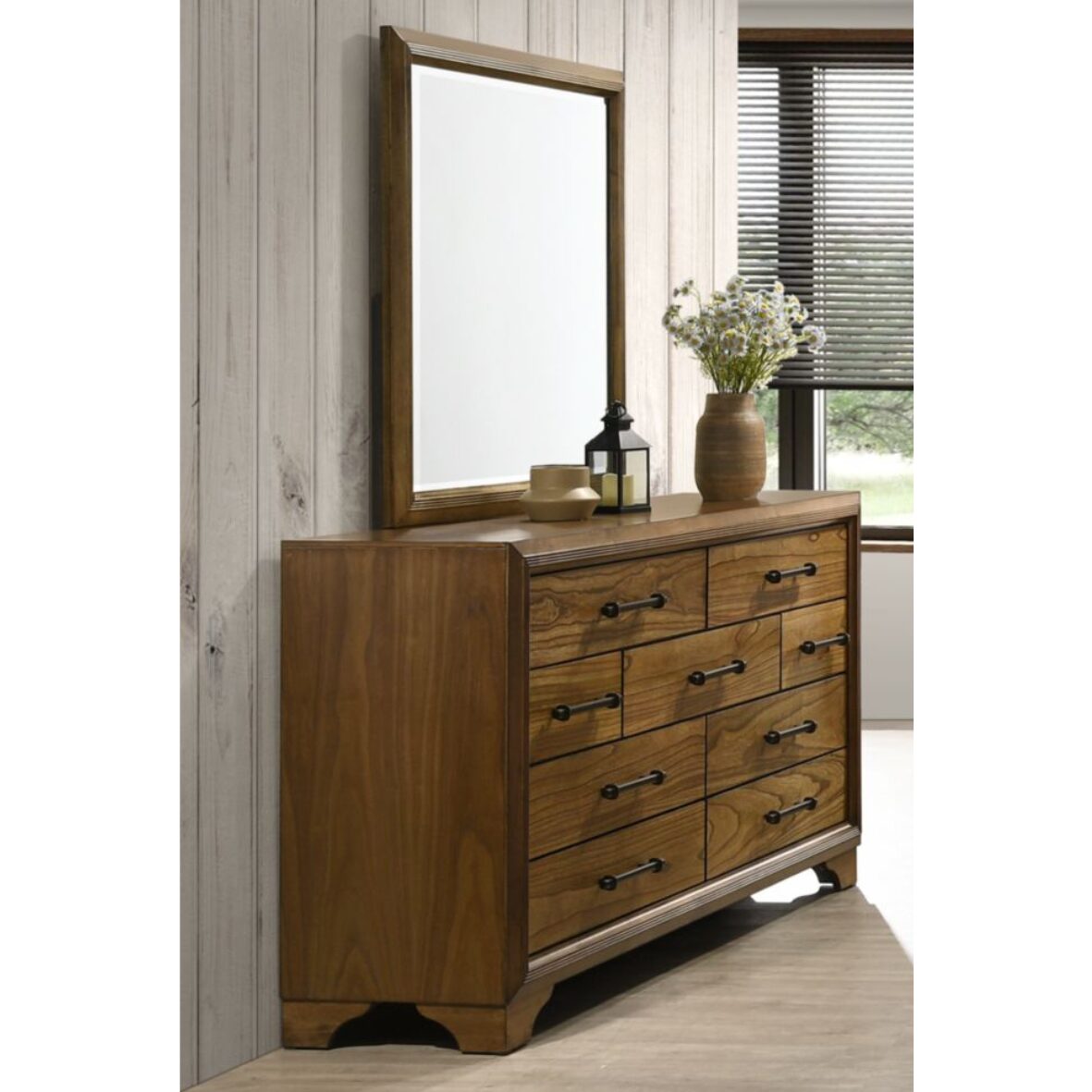 Whether you lean towards modern loft or farmhouse, the panel bed, nightstand, chest of drawers and dresser with mirror are the perfect look. The whitewash finish enhances the style with the stylish weathered look. You’re sure to find the retro-chic light sconces and slat style headboard to be a totally bright idea, while the metal drawer pulls elevate the aesthetic. What a delightful take on rustic industrial.
