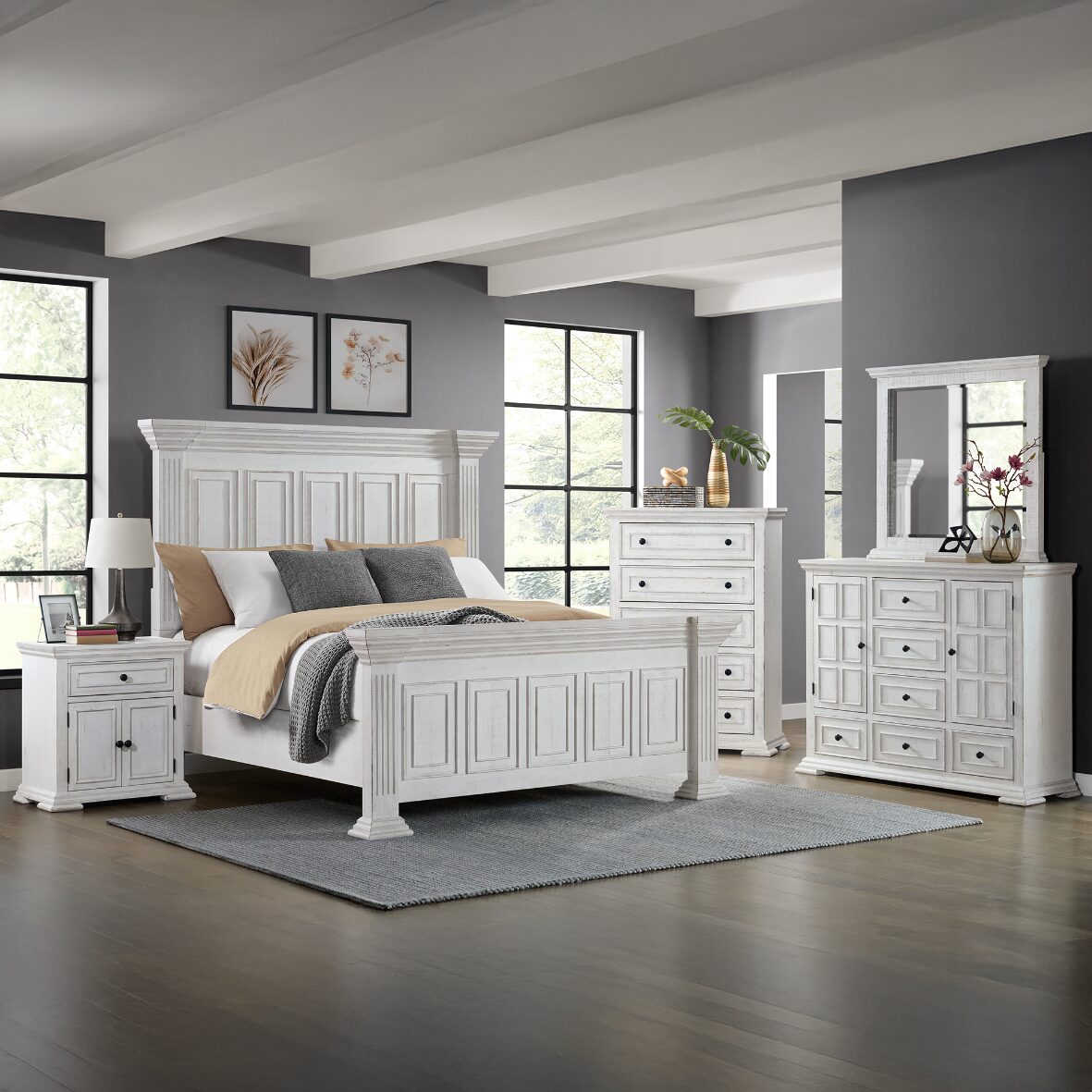 The Antique White Mansion Queen Bed features a rustic and robust design, characterized by its distressed white finish that gives it a charming, vintage look. The bed is constructed with thick posts and solid panels, providing both durability and a commanding presence in the bedroom. Accents of natural wood on the tops of the posts and the headboard add a touch of warmth and contrast to the white finish. This bed is ideal for those seeking a blend of rustic farmhouse style with a touch of elegance.