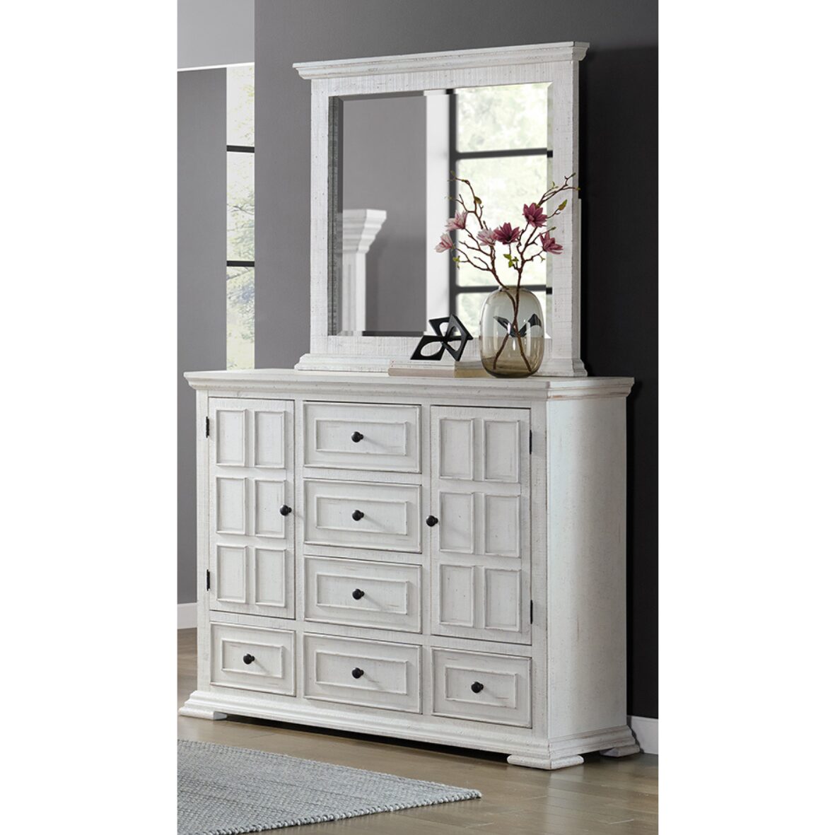 The image shows the Heather Rustic White Dresser and Mirror. The dresser is a rustic, farmhouse-style piece made of wood with a distressed white finish that gives it a vintage, weathered appearance. It has a rectangular shape with a thick, molded top and a sturdy, decorative base featuring carved feet. The front design includes 6 drawers with a two round black knobs and 2 cabinets. The drawers and cabinet doors are framed with beveled molding that adds depth and character to the piece. Subtle distressing along the edges highlights the craftsmanship, creating a charming and timeless look suitable for a cozy or traditional bedroom setting.