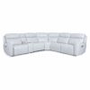 The Polar White Leather Six-Piece Sectional is a stylish and comfortable seating solution designed for spacious living areas. Upholstered in white leather, it features a sleek, modern design with plush cushioning and padded armrests. The sectional includes multiple reclining seats and a built-in console with cupholders for added convenience. Its modular configuration allows for versatile arrangement options, making it a perfect centerpiece for relaxation and entertainment.