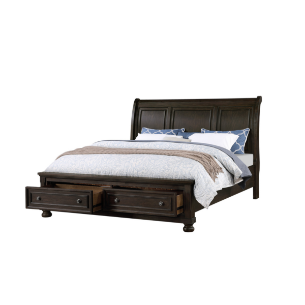 The Lauren Queen Storage Bed is a stylish and functional piece featuring a dark wood finish with a classic sleigh headboard. It includes two spacious footboard drawers, providing extra storage without compromising on elegance. Perfect for maximizing space in a sophisticated bedroom setting.