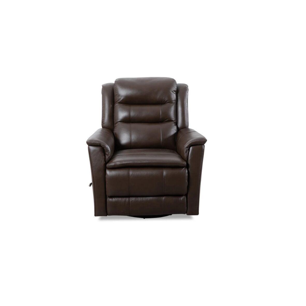 The Leather Madrid Chocolate Swivel Glider Recliner features rich chocolate-brown leather upholstery with a smooth, slightly glossy finish that gives it a refined, cozy look. Generously padded cushions, a tiered backrest, and plush armrests provide excellent support and comfort for extended lounging. A discreet side-mounted lever allows for easy reclining, while the sturdy base enables smooth swiveling and gentle gliding motion. With its clean lines and substantial silhouette, this recliner balances classic style with everyday relaxation.