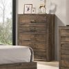 The Nathan Chest combines a distressed gray oak finish and modern black hardware, offering spacious, dust-proof drawers and clean, straight lines for a sleek, transitional design. Crafted from plywood and solid wood with wire brush framing, and engineered wood with melamine surfaces, it ensures durability and a smooth finish. Wooden handles with a black finish complete the sophisticated look.