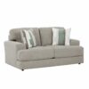The Juana Love Seat features a modern design with a neutral color palette, combining a soft light-gray fabric on the cushions and a darker gray base. It includes plush back cushions and three decorative throw pillows with geometric patterns, providing both comfort and style.