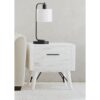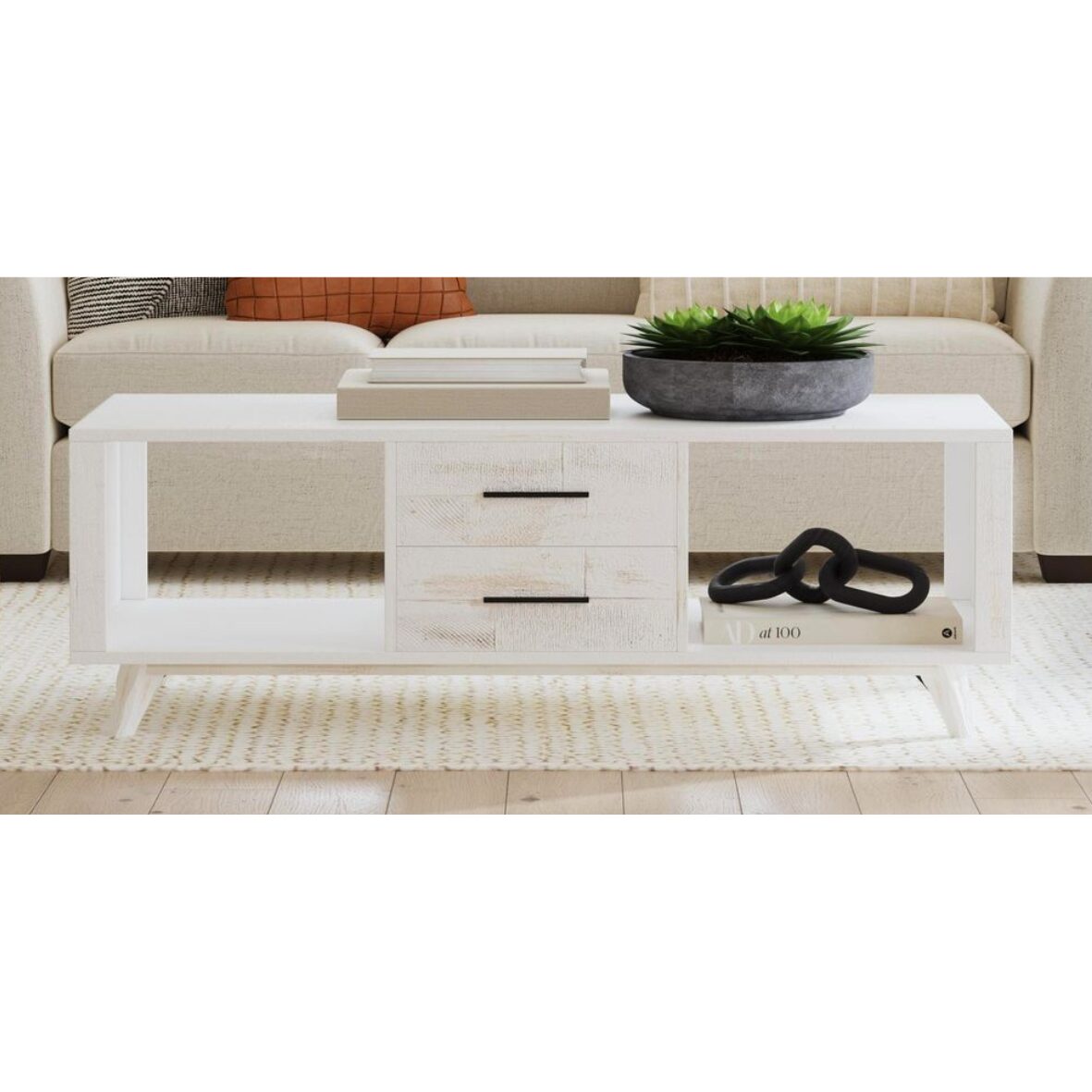 The Rogen Rustic Coffee Table brings a perfect blend of vintage charm and modern functionality to your living space. Featuring a rustic white finish, it adds a timeless touch that complements a variety of decor styles. Crafted with a sturdy wood frame and acacia veneer, it showcases a beautiful natural grain finish. The two spacious drawers, constructed with English dovetail joints and ball-bearing glides, offer smooth and durable operation for convenient storage. An open shelf provides ample space for displaying decor or storing books, while sleek metal handles and angled legs lend a modern rustic aesthetic that enhances any room.