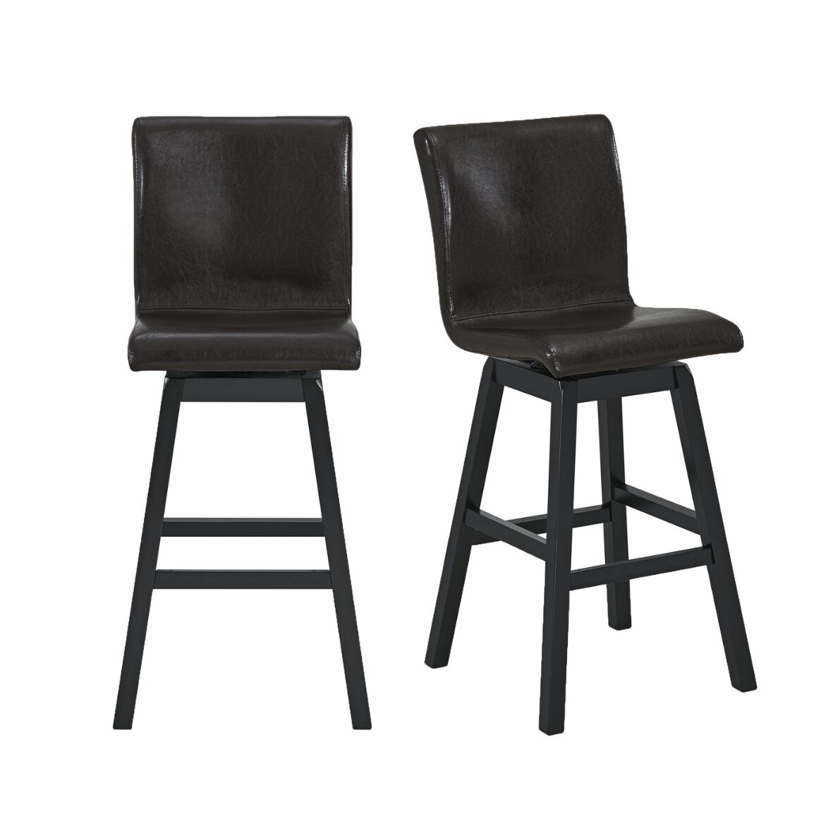 Complement your dining area with the sleek, modern style of the Rylan Swivel Barstools. These unique, bar height stools are crafted with the quintessential pub swivel motion for ease of movement. Just under the stylish and comfortably cushioned faux-leather upholstered backs and seats lay footrests constructed with the convenience of your guests in mind. Designed with supportive, high backs and an armless profile, these chairs equip your dining space with comfortable practicality. For a stylish and refined addition to your dining area, the Rylan Swivel Barstools are the clear choice.