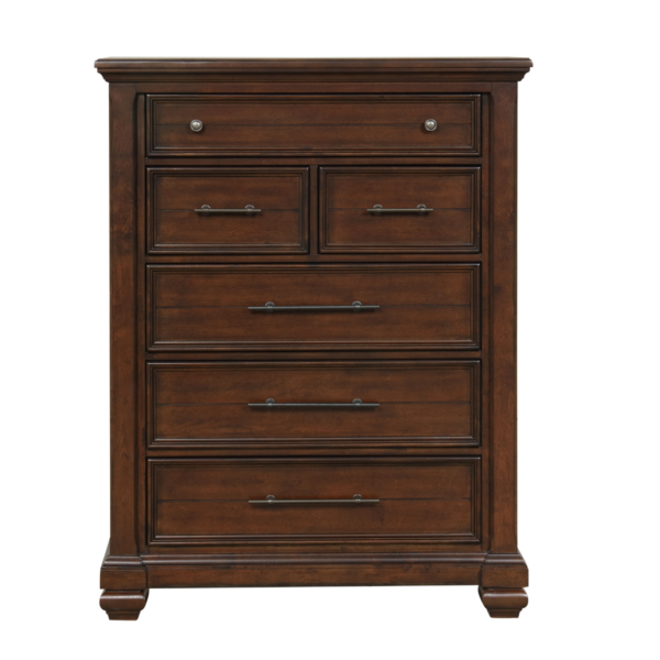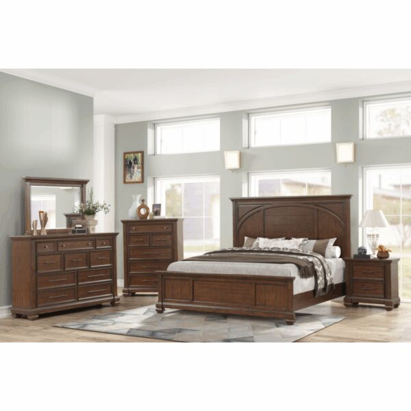 The Caldwell Bedroom Group offers a perfect blend of classic elegance and modern functionality. Featuring a stately bed with an upholstered headboard and built-in storage, this collection exudes sophistication with its rich dark wood finish and refined molding details. The spacious chest, dresser, and nightstand provide ample storage with a mix of stylish metal hardware, while the coordinating mirror enhances the room’s depth and brightness. Designed for contemporary living, the nightstand includes built-in USB ports, LED lighting, and wireless charging capabilities. The Caldwell Bedroom Group brings timeless style and practical convenience to any bedroom.