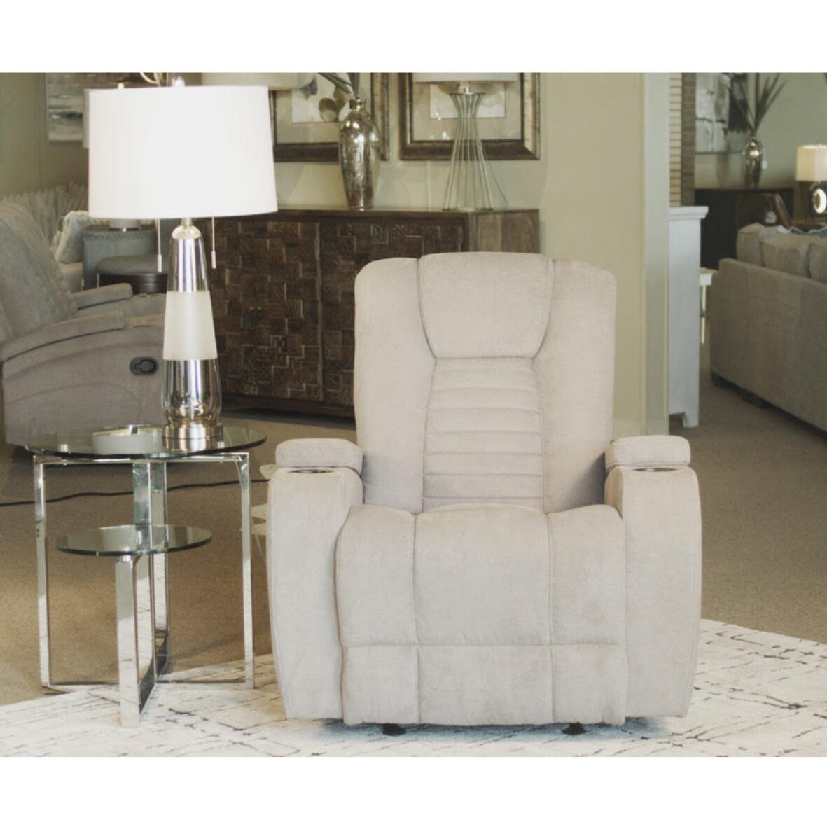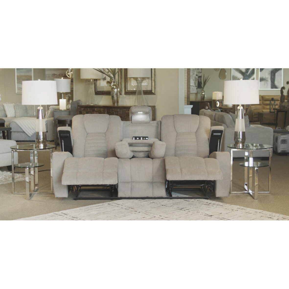 Relax in modern comfort with the Vienna Taupe Living Room Group. This collection combines sleek design with plush support. The reclining sofa features a convenient drop-down table with built-in lighting, while the matching console loveseat and recliner offer cupholders and storage for added convenience. Perfect for movie nights or everyday lounging, the Vienna brings contemporary style and functionality to your home.