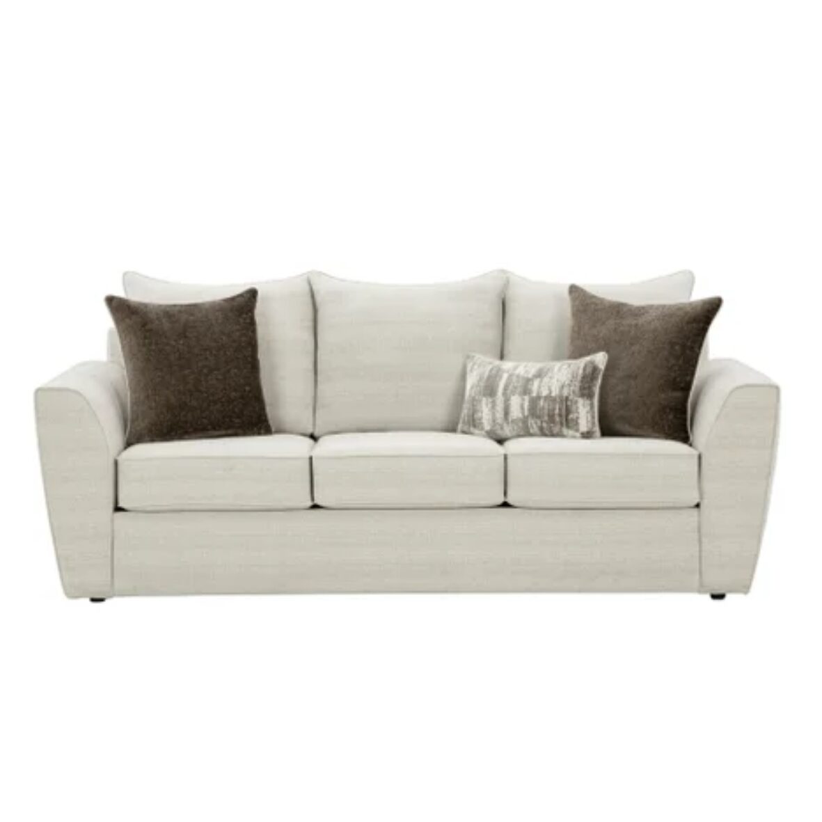 Upholstered in fabric and accented by a variety of beige highlights, this Sofa exudes an aura of warmth and welcome. Chic and brimming in softness, the texture complements the slightly rounded silhouette. Lounge on the wide, firm seat cushions or lean your head over the low, padded structured track arms.